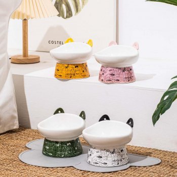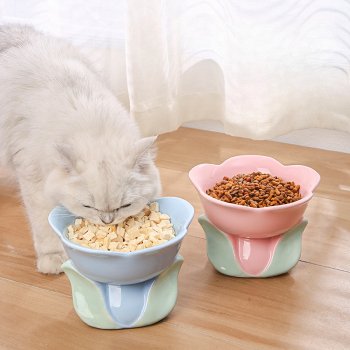 Flower Ceramic Cat Bowl with Raised Neck-Protection Design